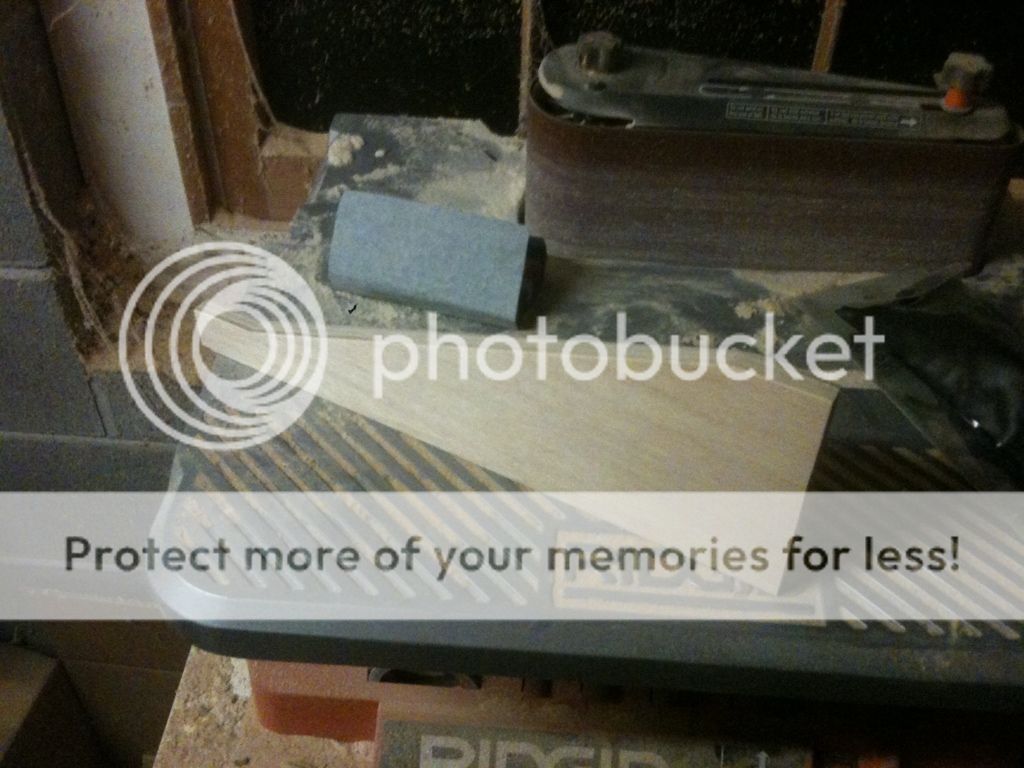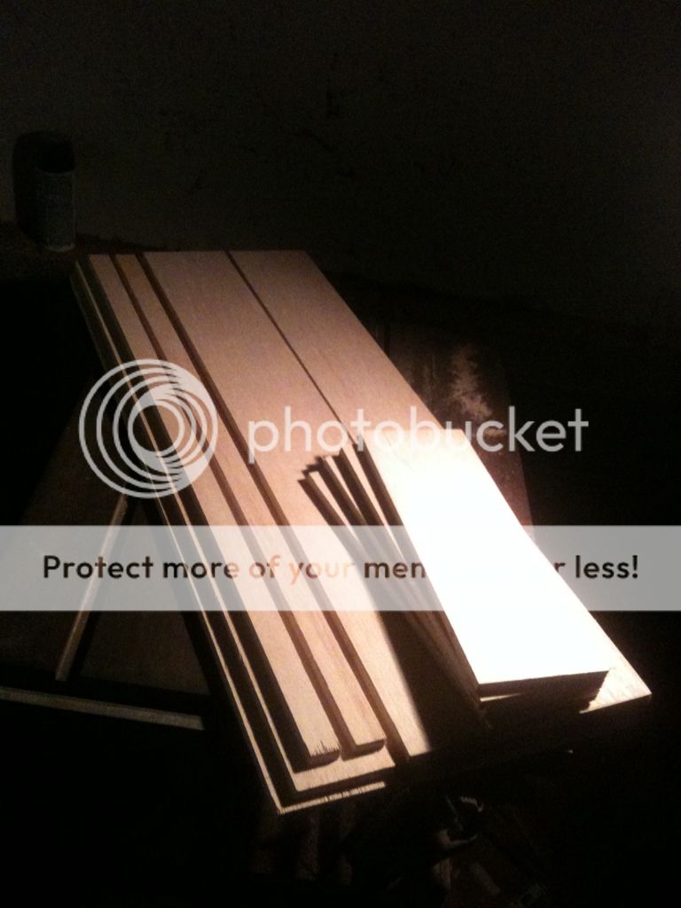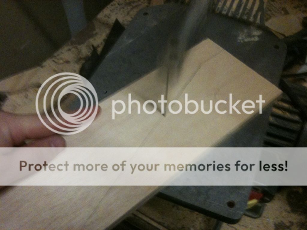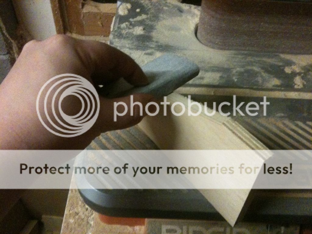 I could tell by the bare wood showing in the neck pocket that it was made from mahogany (or some Asian cousin) so I figured it had potential for this project. I wasn't a huge fan of the double humbucker configuration and the control layout bugged me, not to mention the insanely thick poly finish. So I set out to strip said poly finish off, hoping to see some half-way decent looking mahogany underneath. The chemical stripper I used didn't do much, and it certainly didn't reveal any mahogany. What finish I was able to remove revealed a thin maple cap. I'm guessing Epiphone uses these for the sunburst models and also so there's less grain filling involved in the finishing steps. Anyway, I took the body over to my router planer jig, and thinned the body down, eliminating the maple top (it was barely an 1/16" thick) a I also planed down the back, just enough to get off the thick finish. After some sanding on the ROSS (Rigid Oscillating Spindle Sander) I finally got it down to the bare mahogany.